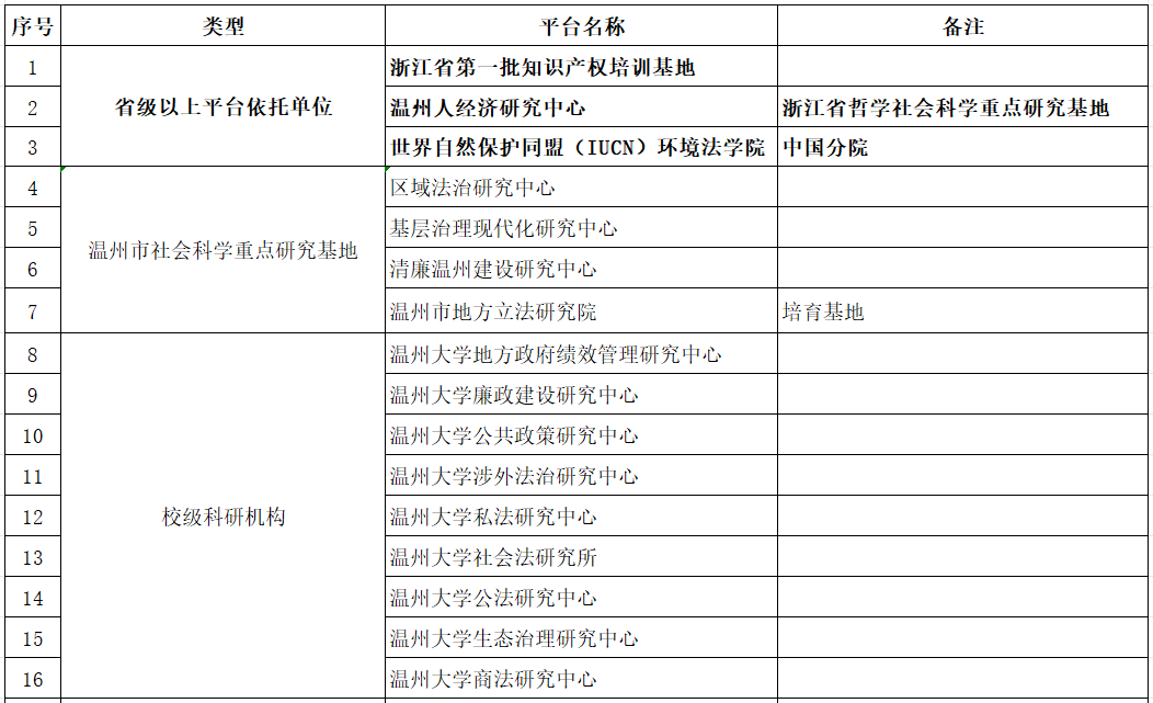 法学学科为浙江省一流学科(B类)、温州市重点学科、温州大学重中之重学科。2003年设立法学本科专业,系国家级一流专业、浙江省一流专业、浙江省特色专业(评审类)、温州市重点专业、温州大学博士学位培育点、温州大学重点专业。2006年设立马克思主义基本原理二级硕士点(法学方向)。2012年设立马克思主义法学(目录外二级点)。2018年获批法学一级硕士点及法律专业硕士学位点,法学学位点设有宪法学与行政法学、诉讼法学、民商法学、经济法学、环境与资源保护法学等五个研究方向,法律专业硕士学位点不设研究方向,于2019年开始招生。