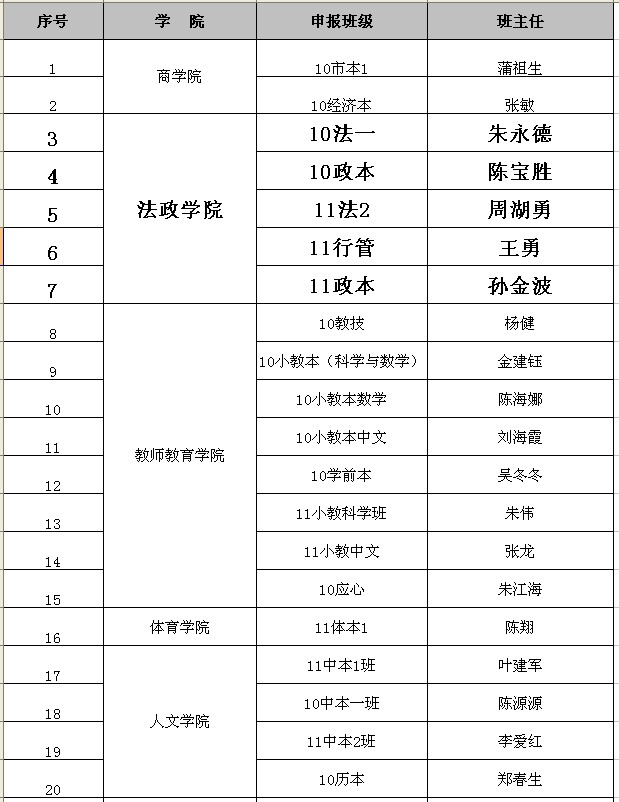 根据温州大学2012/2013学年"优良学风班"申报工作的通知要求,经班级申报、学院初审、学生处审核、学校公示,决定对10市本1班等62个班级进行立项,现将结果予以公布。请各学院对照创建方案和目标,广泛动员每一位学生积极参与到优良学风班的创建中来,确保立项目标的实现。立项班级的培育期为一年,学校将于下学年初从通过验收的立项班级中择优产生温州大学2012/2013学年"优良学风班",此次法政学院共有5个班级立项。