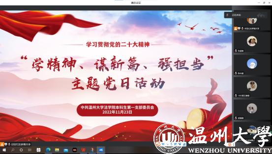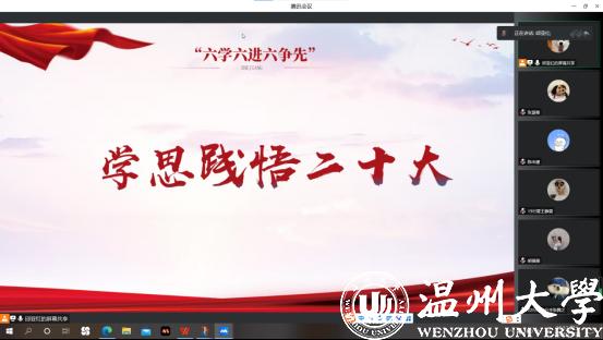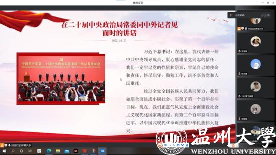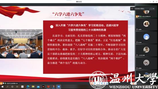 学党史,强信念,跟党走。为深入学习宣传贯彻党的二十大精神,深入开展“六学六进六争先”学习实践活动,更加坚定紧跟核心奋进新征程的政治自觉,努力在新的赶考之路上继续干在实处、走在前列、勇立潮头,麻豆 本科生第一党支部于2022年11月23日下午开展线上“学精神、谋新篇、强担当”主题党日活动。本次会议应到会党员39名,实到会党员39名。本次活动本次活动共分为四个部分:学习贯彻党的二十大精神、浙江省第十五次党代会精神学习、“六学六进六争先”学习、学思践悟二十大,由邱亚红同志主持,支部全体党员和预备党员参与了此次活动。