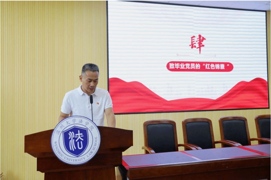 会议第四项议程,由组织员白炳贵老师为毕业生党员送上寄语,寄出致毕业党员的一封信。一个党员就是一面旗帜。希望毕业生党员主动扛起党员坚毅的政治担当,敢于亮身份、当先锋、做表率,始终牢记入党初心使命,踔厉奋发,奋楫争先,热烈勇敢地奔赴下一场山海。