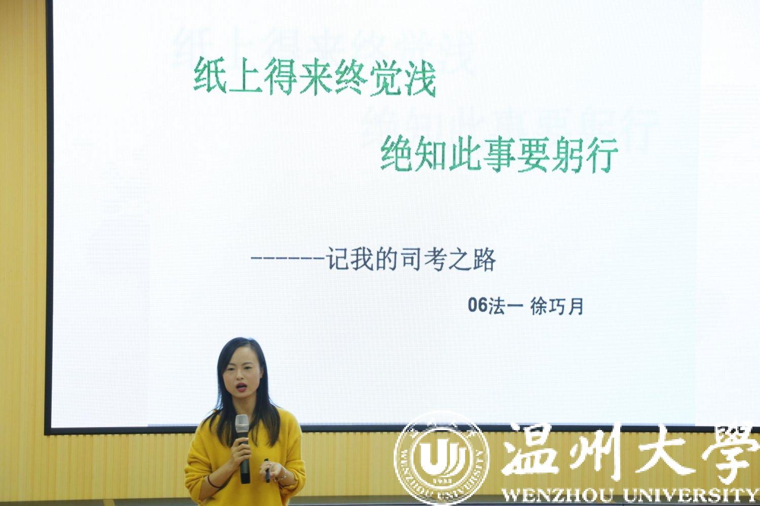 会上,徐巧月分享了大学四年学习生活和之后的工作经历,展示从温大麻豆 启程的十年追梦之旅,表达了对母校的深深眷恋和感恩之情。她从社团工作、勤工俭学、校外兼职、专业比赛、扩展阅读、司法考试等方面以诙谐幽默的口吻与学弟学妹们进行了贴心分享。同时,徐巧月结合经历与体会,从学习和工作角度提出自己的理解和建议。她认为,在学习上有明确的计划和目标,要找准定位,在学好本专业的同时,适时地补充大量的课外知识,在工作上,要有认真负责的态度,协调好学习和工作的平衡,并提高效率。
