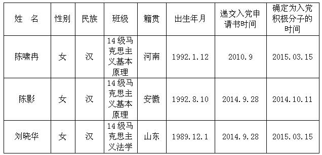 经中共温州大学法政学院研究生党支部培养考察,认为以下同志(具体名单附后)已基本具备中共预备党员条件,拟于近期发展,现予以公示。