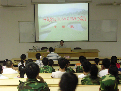 | 为了做好今年暑期社会实践的总结工作,让更多的学生了解暑期社会实践的目的、意义,总结交流学院各支队伍取得的成绩,找出存在的不足,法政学院开展了2006年暑期社会实践的一系列总结交流活动。 这次活动主要由两部分组成:一是举办了"暑期社会实践成果展。"各支队伍运用图片录象等形式充分展示了同学们不顾高温酷暑,深入社会生活最前沿调查研究、服务社会的英姿和丰硕的成果;二是召开暑期社会实践经验交流会。9月22日晚,学院召开了暑期社会实践经验交流会,全院26支队伍的代表和06级新生代表参加了会议。 院党总支书记陈国治教授、副院长王柏民教授、学生科科长杨振海老师参会议,辅导员郝舒老师主持会议。陈书记首先代表学院领导班子对参加今年实践的26位老师、230多位同学表示热烈的祝贺。他对实践队员们表现出的高度热情,以及克服各种困难的精神表示了肯定,并表扬了他们对社会的责任感、开展实践活动的积极性。最后陈书记还谈了自己的几点感受:大学生参加社会实践的必要性;在实践中要做有心人,认真思考社会现象中的各种问题,结合理论进行深入的思考与探讨;实践应该与自己的专业紧密结合,争取为专业的学习增加求知的动力。接着此次实践中表现突出的总工会实践队、04社本实践队、新失业群体调查队、关注民工实践队、志愿者西部行服务队等一一上台做了实践总结、汇报,并谈了各自的感受。 最后,王院长就本次活动做了点评,并就自己的感受向在场的同学谈了几点要求:首先对实践要有思想上的充分认识,把它摆到正确的位置上,社会实践并不只是拿学分,更重要的是锻炼能力;其次,为了方便实践,要做好师生联络,师生结合;第三,建议已经实践过的同学,今后继续参加暑期社会实践,高年级带动低年级,并做好每一次实践的总结。 暑期社会实践让同学们受益匪浅,大家深切感到,这次活动不仅使我们学到了书本以外的许多知识,而且进一步认识了社会,学会了怎样用专业服务社会。愿法政学子的社会实践之路越走越好。 通讯员:张丹东 2006-9-23