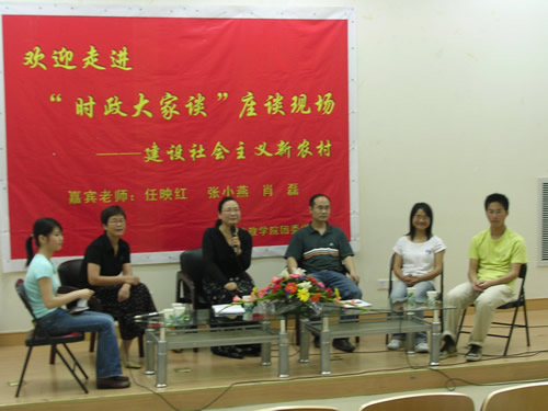 | 5月24日晚,法政学院"时政大家谈"大型论坛活动在南校区会展中心步青厅举行。本次论坛主要围绕时下热门话题"建设社会主义新农村"展开。我们很荣幸请到了本学院的任映红教授、张小燕教授、肖磊老师作为本次论坛嘉宾,和同学们一起探讨社会主义新农村的建设问题。 首先,任教授向同学介绍了社会主义新农村建设的提出背景。紧接着张教授、肖老师分别从自己身边农村的变化和农村法制建设现状等方面阐述了建设社会主义新农村的必要性。随后,大家结合身边的典型例子就"如何建设社会主义新农村"、"怎样使农民心甘情愿的投入到建设新农村中去"等问题展开了激烈的讨论。同学们积极踊跃,各抒己见,台上台下做到了充分的互动。本次论坛取得了预期的效果,使同学们在轻松的氛围中了解国家政策、增长课外知识、提升个人修养。 通讯员:金哲谊 附图片: