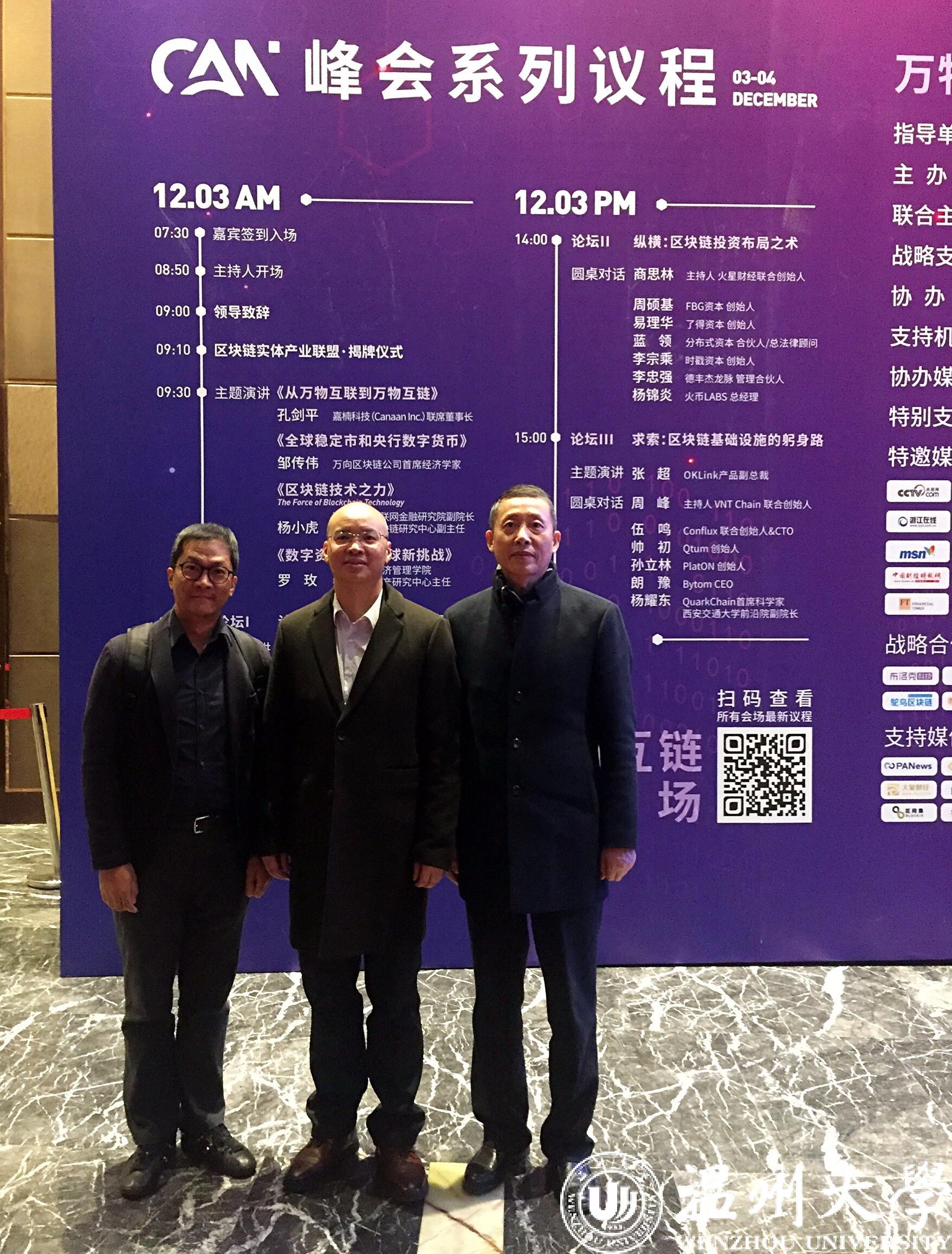 12月3日,麻豆 院长王宗正、党委书记林钦、副书记杨振海一行,受杭州嘉楠耘智信息科技有限公司联席董事长孔建平(系我院2008届法学专业优秀校友)邀请参加2019CAN大会·万物互链·区块链与全球经济新格局峰会。此次大会由杭州市人民政府为指导单位,CAN大会组委会联合嘉楠科技和浙江清华长三角研究院杭州分院主办。本届大会以促进区块链技术革新、产业变革、生态协同发展为宗旨,引领经济创新、转型升级。大会邀请了近百名政府领导、业内著名专家学者、行业权威、投资机构和上市公司嘉宾。会上,杭州嘉楠耘智信息科技有限公司联席董事长孔建平受邀作《从万物互联到万物互链》的主题演讲。