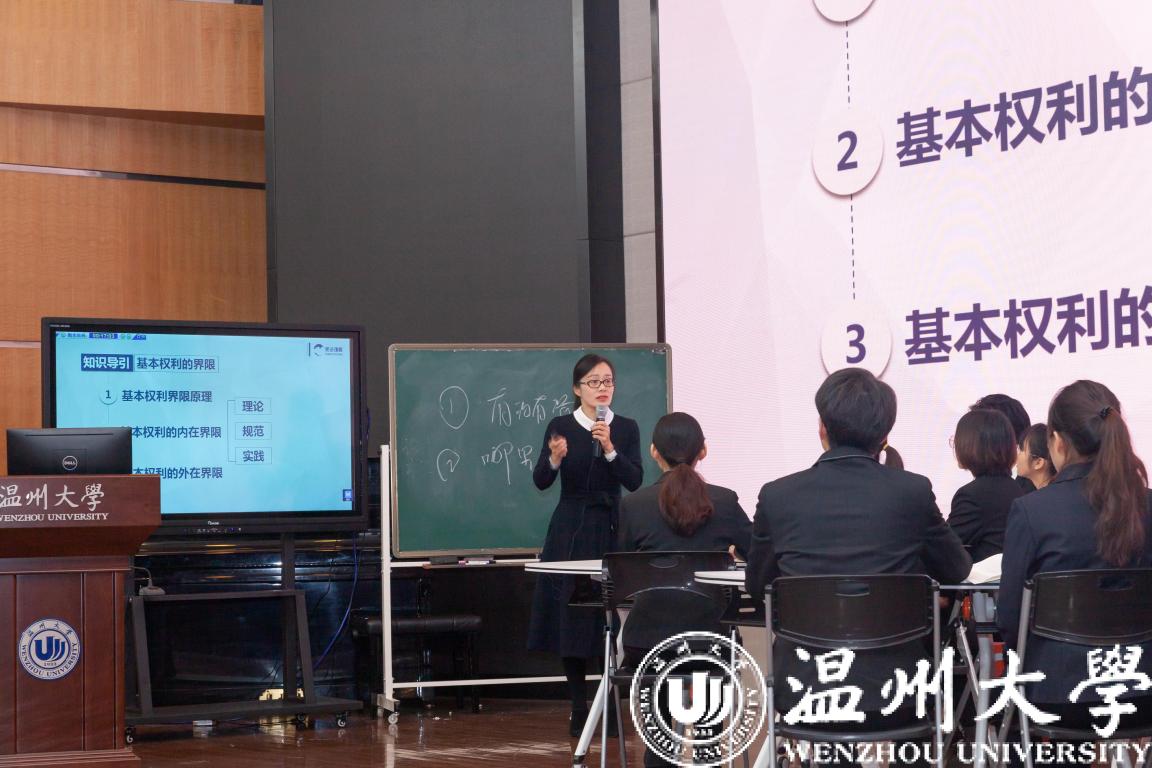 项一丛老师以《基本权利的界限》为题,从香港“禁蒙面法”违宪裁判引入,呈现知识单元的完整教学,有效掌控课堂教学节奏和氛围,课程思政和专业思政教学目标突出,赢得了评委的一致认同,获得了高分。