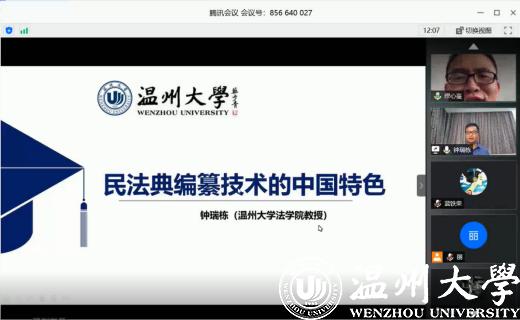 5月29日下午2点,温州大学罗山法学研习社、温州大学私法研究中心邀请麻豆 钟瑞栋教授,以腾讯会议形式开展了我院本学期第一次云讲座——《民法典编纂技术的中国特色》。院长王宗正、副院长缪心毫及麻豆 师生们参加了本次讲座,讲座由副院长缪心毫主持。