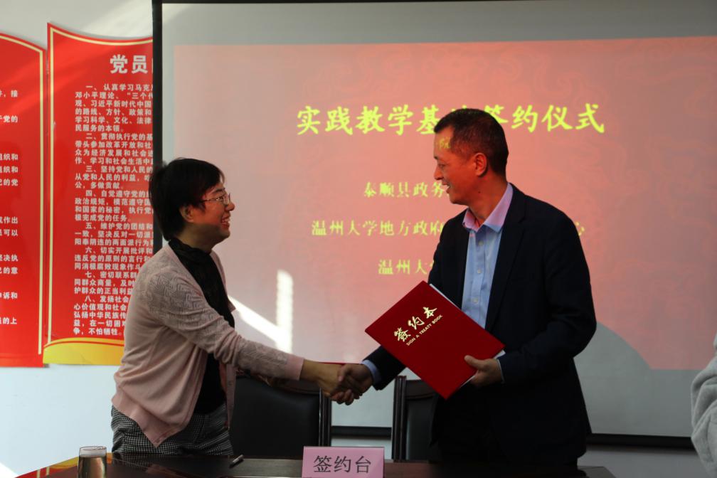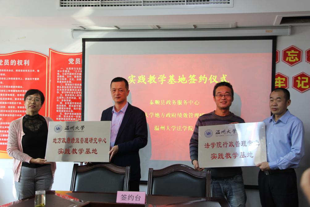 温州大学地方政府绩效管理研究中心主要从事政府绩效管理咨询、评估、考核与研究工作,致力于为学院行政管理专业发展服务,为学生见习、实习及社会实践提供平台支持。本中心与泰顺县政务服务中心此次通过建立实践教学基地合作关系,一方面将有益于提高行政管理专业学生在相关领域内的专业能力、提升其专业竞争力;另一方有利于推动泰顺县行政审批服务制度改革、深化“最多跑一次”改革及服务效率的提高。
