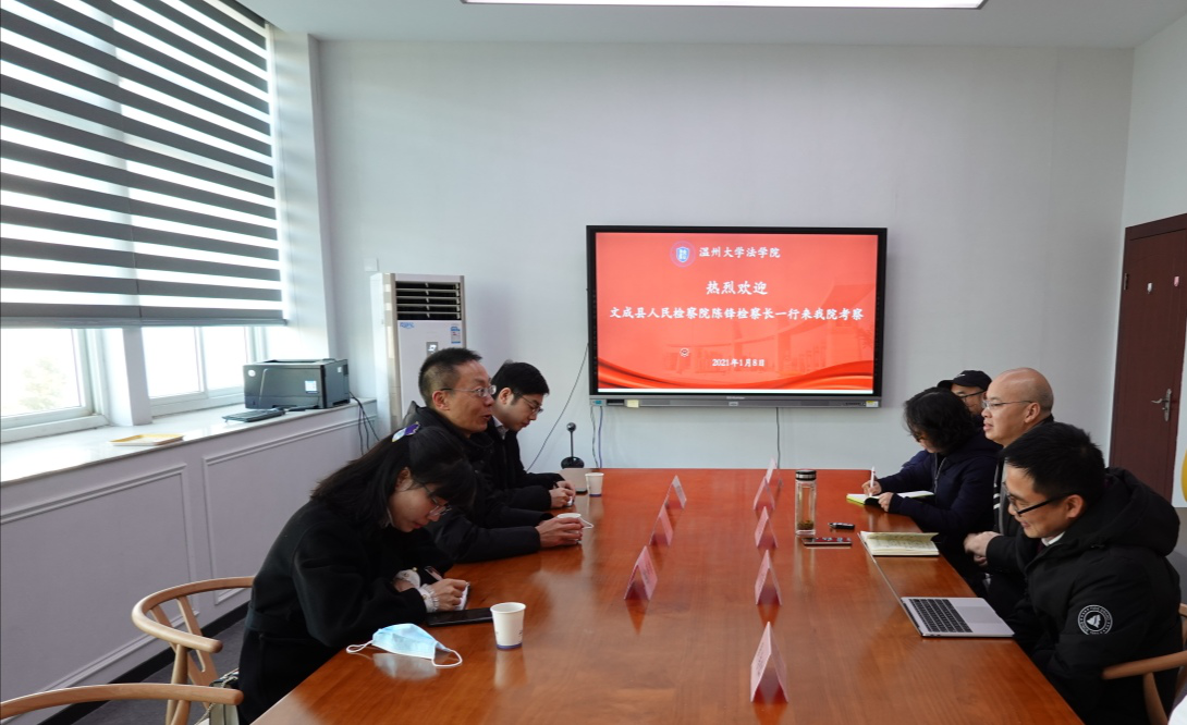 2021年1月8日上午,文成县人民检察院陈锋检察长、副检察长陈伟银、苗东欣一行三人来访我院,在参观我院后双方在麻豆 314会议室举行了座谈会。我院王宗正院长、缪心毫副院长、谢丽珍老师、肖磊老师、周浩仁老师参加座谈。