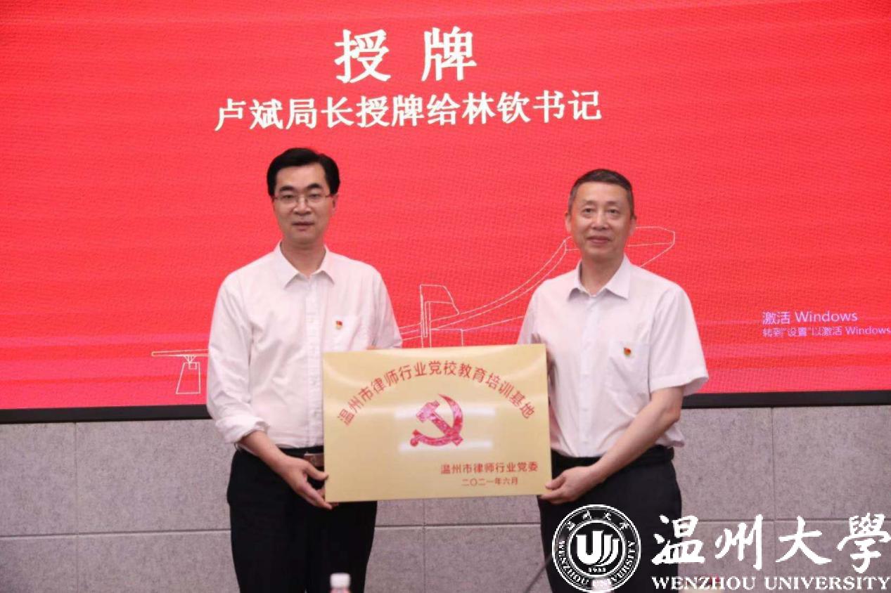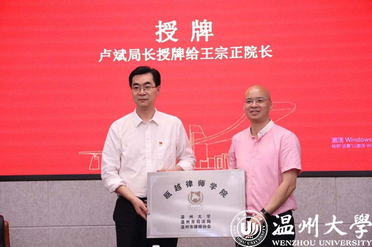 仪式上,林向光副局长、叶连友会长和周湖勇副院长分别代表温州市司法局、温州市律师协会、温州大学签署了合作设立瓯越律师学院协议。卢斌局长向王宗正院长授瓯越律师学院牌匾、向林钦书记授温州市律师行业党校教育培训基地牌匾。