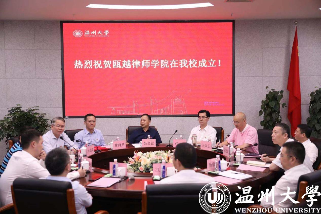 吴金法副书记用三句话总结了瓯越律师学院成立的基础:一是社会有需求,温州青年律师人才数量庞大,律师队伍发展很快,瓯越律师学院对培养高素质的律师人才,推动温州市律师行业高质量发展,更好的服务温州地方经济社会发展有重要意义;二是温大有基础,温州大学多次与司法局、仲裁委员会等有关单位进行深度合作;三是温大有信心,充分发挥法学专业的优势,积极打造律师培养基地。总之,温州大学有信心将瓯越律师学院建立成具有全国知名度的实践性的法律教育培训平台。