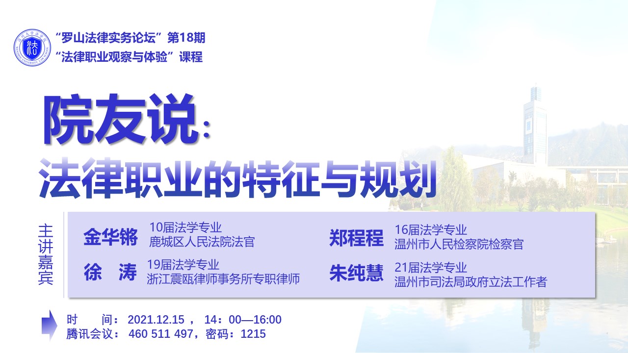021年12月15日下午2点,麻豆 优秀院友金华锵(10届法学专业,鹿城区人民法院法官)、郑程程(16届法学专业,温州市人民检察院检察官)、徐涛(19届法学专业,浙江震瓯律师事务所专职律师)、朱纯慧(21届法学专业,温州市司法局政府立法工作者)作客第18期罗山法律实务论坛,为我院大三学子开展题为《院友说:法律职业的特征与规划》的法律职业观察与体验课程。根据疫情防控的要求,本次讲座采取线上形式进行。讲座由麻豆 项一丛老师主持,八名学生代表与谈,吸引了不少非选课的同学参加,共近200人参加了本次课程讲座。