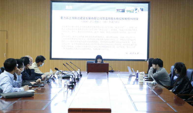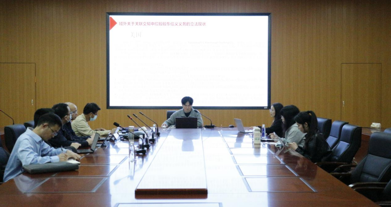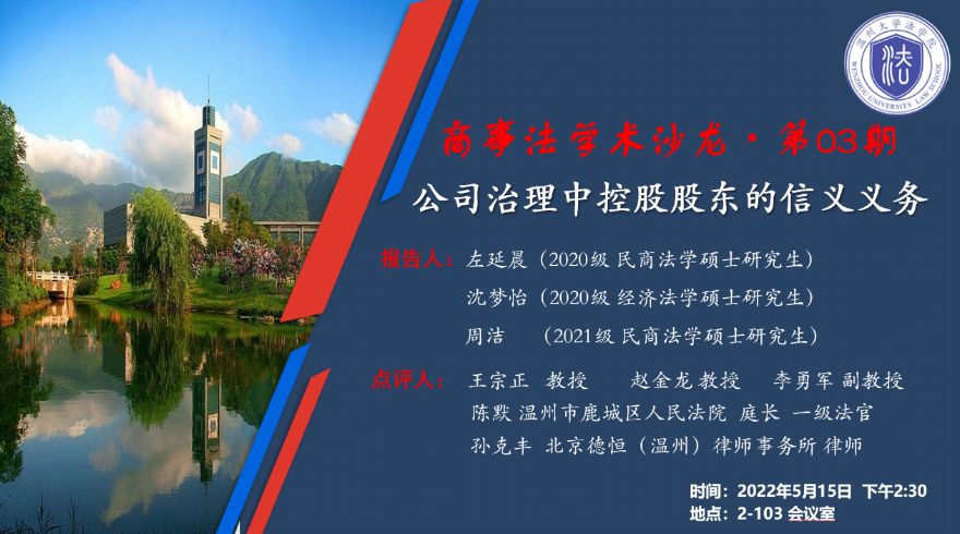 2022年5月15日下午,“商事法学术沙龙·第03期”活动在麻豆 103会议室如期举行,本次沙龙活动围绕“公司治理中控股股东的信义义务”展开。2020级民商法学硕士左延晨、经济法学硕士沈梦怡,2021级民商法学硕士周洁围绕主题作专题汇报,麻豆 王宗正教授、赵金龙教授、李勇军副教授、温州市鹿城区人民法院民二庭庭长(一级法官)陈默,北京德恒(温州)律师事务所孙克丰律师等作为点评人参与沙龙讨论。