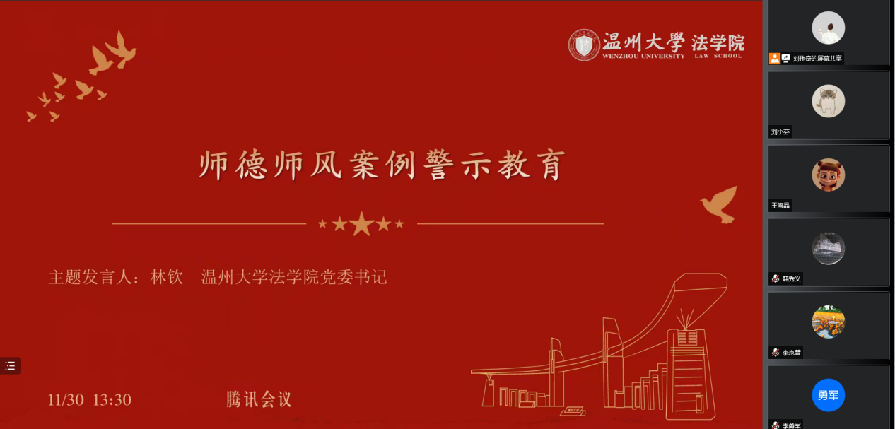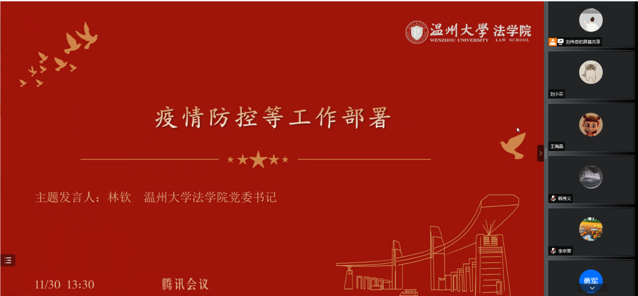 党委书记林钦做师德师风案例警示教育与疫情防控等工作部署。他从反面案例提醒学院教师要注意切勿发表不当言论,注意网络文明发言、端正学术态度、保持正当的师生关系,把握正常的师生交往尺度,提醒全体教师应当始终坚定政治方向,自觉爱国守法,做有理想信念、有道德情操、有扎实学识、有仁爱之心的好老师。