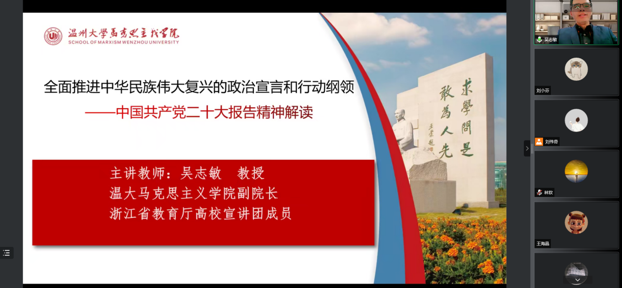 马克思主义学院副院长吴志敏作全面推进中华民族伟大复兴的政治宣言和行动纲领——中国共产党二十大报告精神解读。他从中国共产党第二十次全国代表大会基本概况、中国共产党第二十次全国代表大会报告内容、学习贯彻党的二十大精神的“五个牢牢把牢”三个方面对中国共产党二十大报告精神进行了解读。他指出,我们要牢牢把握过去5年工作和新时代10年伟大改革的重大意义,牢牢把握新时代中国特色社会主义思想的世界观和方法论,牢牢把握以中国式现代化推进中华民族伟大复兴的使命任务,牢牢把握以伟大自我革命引领伟大社会革命的重要要求,牢牢把握团结奋斗的时代要求。