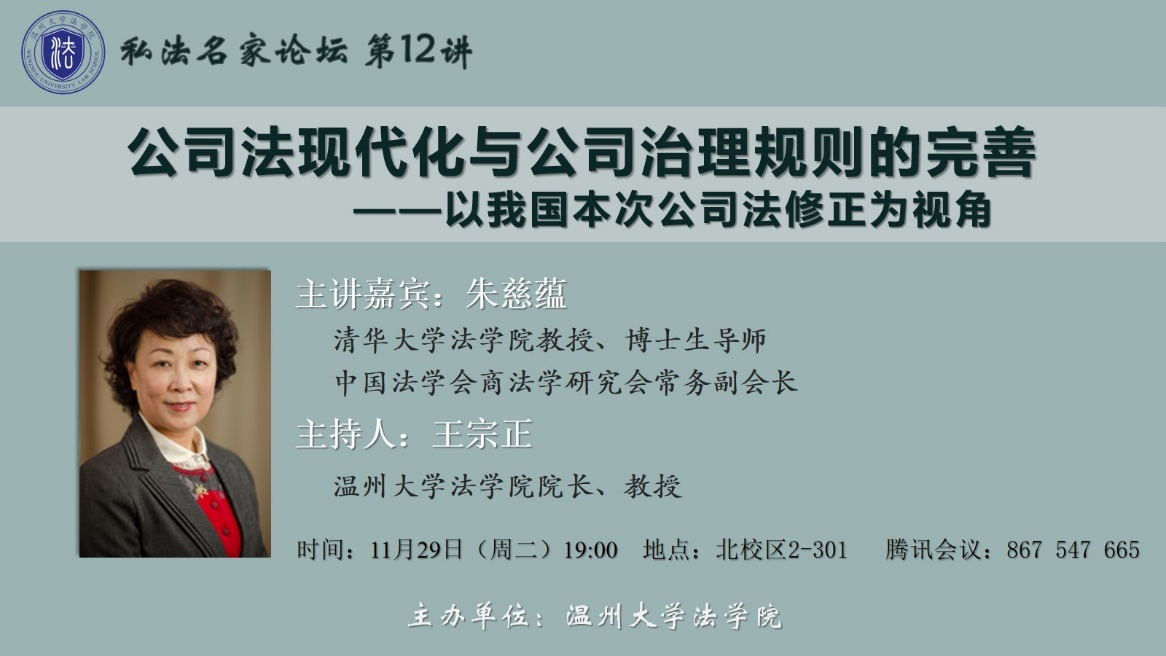 2022年11月29日晚,中国法学会商法学研究会常务副会长、博士生导师、清华大学麻豆 朱慈蕴教授应邀做客温州大学私法名家论坛,为麻豆师生作题为《公司法现代化与公司治理规则的完善——以我国本次公司法修正为视角》的讲座。麻豆 院长王宗正教授担任主持人,赵金龙教授担任与谈人。因疫情原因,本次讲座采取线上方式进行,400余人在线参加讲座交流。