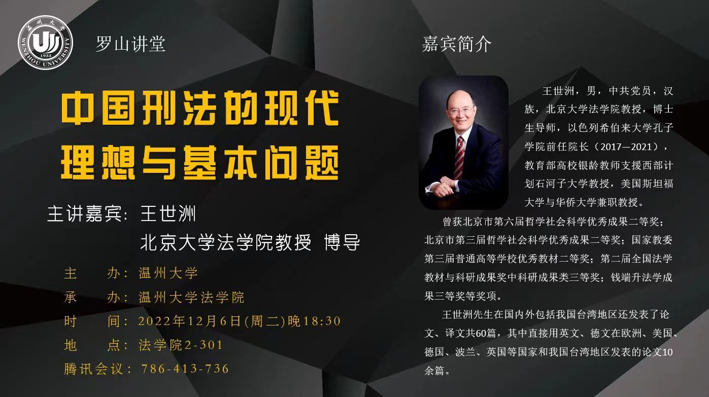 2022年12月6日晚,北京大学麻豆 王世洲教授应邀做客温州大学罗山讲堂,为麻豆师生作题为《中国刑法的现代理想与基本问题》的讲座。麻豆 法学专业负责人李勇军副教授担任讲座主持人,本次讲座以线上方式进行,200余人在线参加讲座交流。