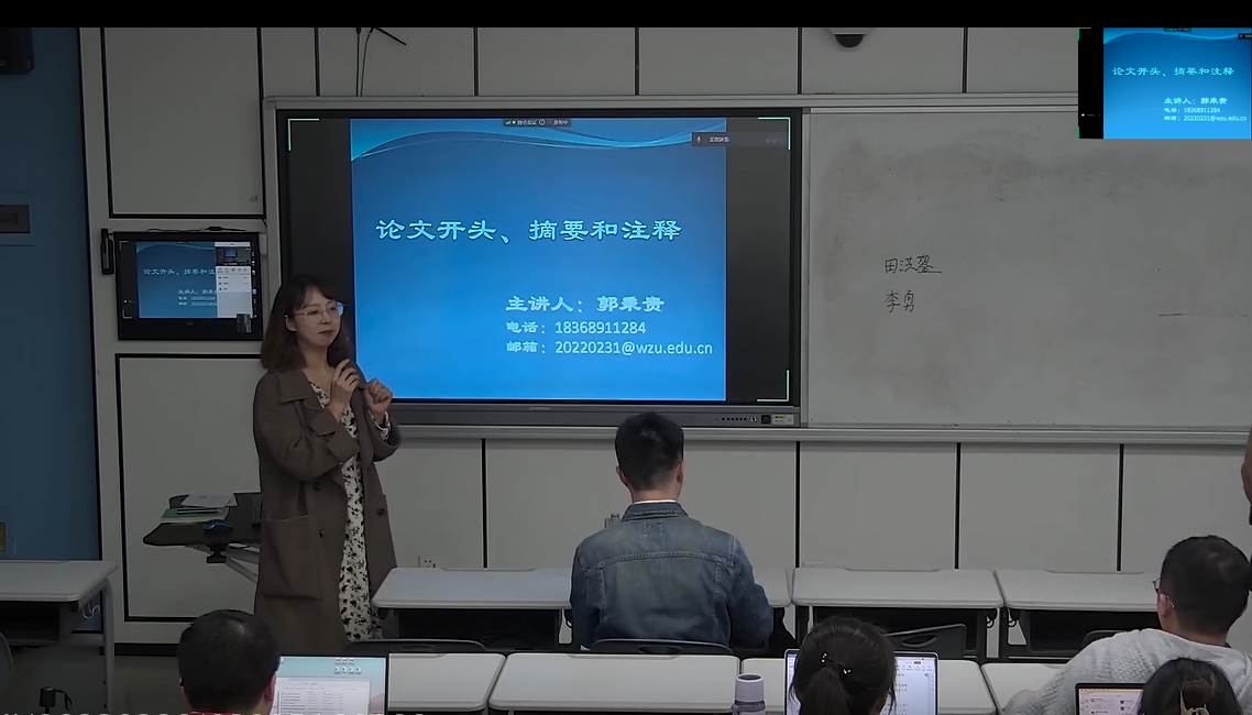 2023年3月29日,郭秉贵老师在21级专硕的法律写作课上,积极推动教学模式改革,探索新的教学方式,与贵州大学麻豆 李勇老师云端连线,双师同堂为21级法律(法学)、法律(非法学)两个班70余名同学讲授学术论文应如何写作。