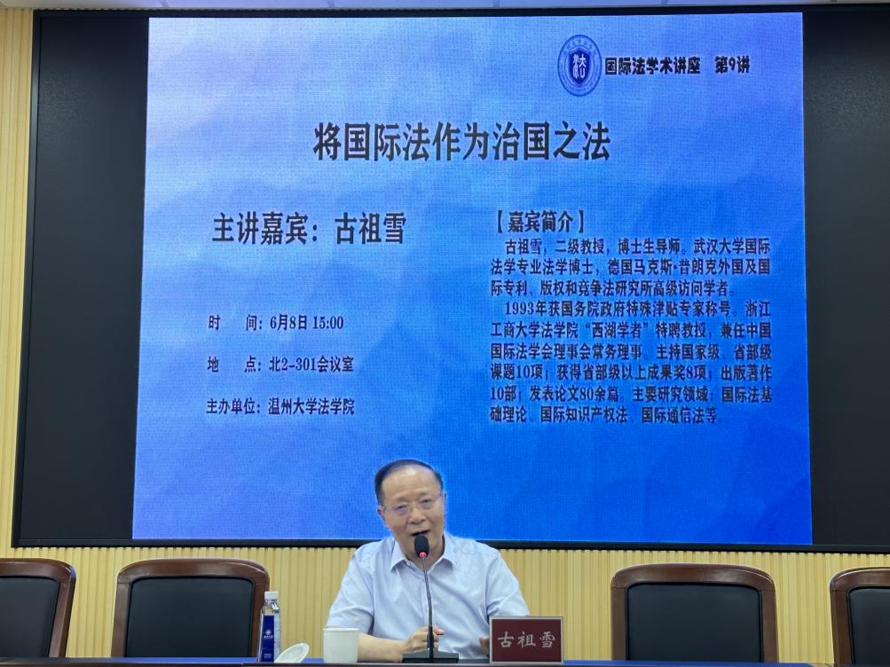 2023年6月8日下午,浙江工商大学麻豆 古祖雪教授莅临麻豆,为麻豆 师生作了主题为“将国际法作为治国之法”的学术讲座。讲座由温州大学期刊社社长缪心毫主持,国际法系主任李娟及全系教师出席。参加本次讲座的还有麻豆 国际经贸规则专业及法学专业的诸多学生。