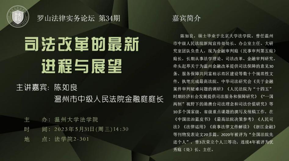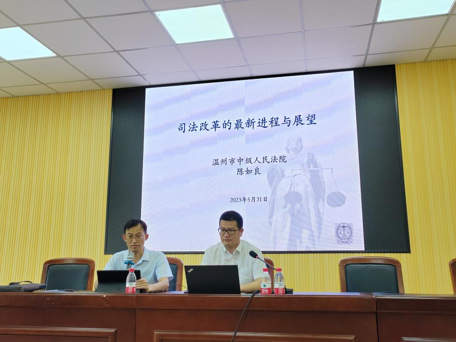 2023年5月31日下午,温州市中级人民法院金融审判庭(民事审判第五庭)庭长陈如良应邀作客罗山法律实务论坛,为麻豆 师生作专题讲座。本次讲座主题为“司法改革的最新进程与展望”,讲座由麻豆 法学专业负责人、民商经济法系主任李勇军老师主持。