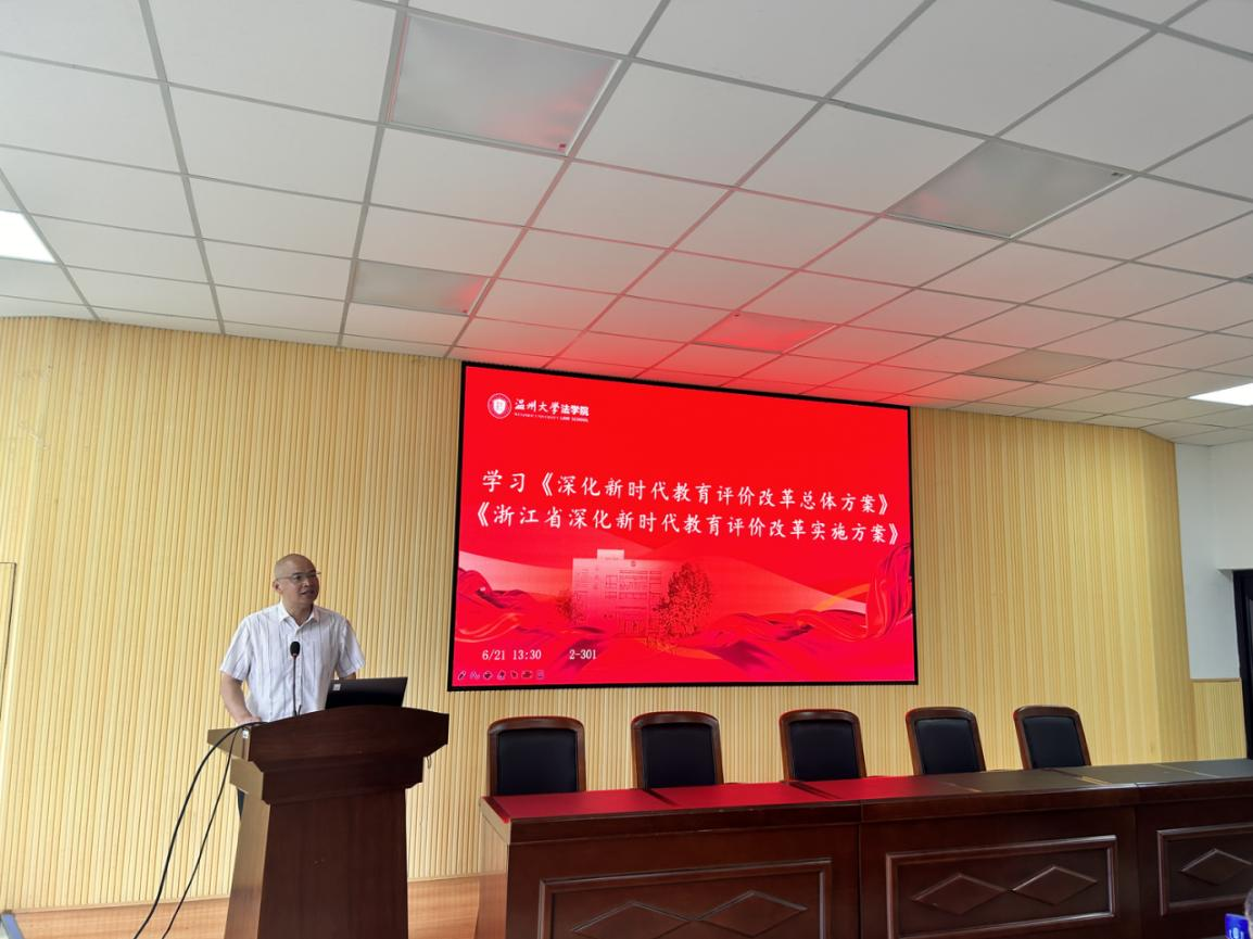 会上首先由王宗正院长领学《深化新时代教育评价改革总体方案》《浙江省深化新时代教育评价改革实施方案》。这是新中国第一个关于教育评价系统性改革的文件。《总体方案》的出台实施,对于全面贯彻党的教育方针,完善立德树人体制机制,破除“五唯”顽瘴痼疾,引导全党全社会树立科学的教育发展观、人才成长观、选人用人观具有重大意义,必将有利于推动构建服务全民终身学习的教育体系,培养担当民族复兴大任的时代新人,培养德智体美劳全面发展的社会主义建设者和接班人,加快推进教育现代化、建设教育强国、办好人民满意的教育。教师是立教之本、兴教之源,教书育人是教师的第一职责。为更好地引导广大教师履行职责,《总体方案》设计了一系列改革任务。第一,坚持把师德师风作为第一标准。第二,突出教育教学实绩。第三,强化一线学生工作。