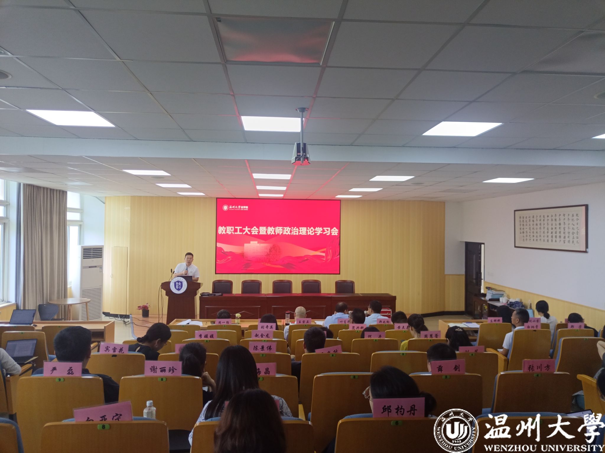 周敬业书记围绕“明师德要求、学师德楷模、遵师德规范、守师德底线”四个方面,作题为《弘扬教育家精神 涵养高尚师德师风》专题党课,带领全体教工系统学习《中共中央 国务院关于弘扬教育家精神加强新时代高素质专业化教师队伍建设的意见》文件精神,学习张桂梅、高铭暄师德楷模甘于奉献、致力教育事业的感人事迹,学习《中华人民共和国教师法》《新时代高校教师职业行为十项准则》《温州大学教师职业行为规范及师德失范行为处理办法》《温州大学教师教学规范条例》《温州大学教职工处分暂行规定》《温州大学处理学术不端行为管理办法》等规范条例。同时,传达教育部公开曝光的高校教师违反教师职业行为十项准则典型案例,要求全体教工以案为鉴,时刻牢记教育初心与育人使命,严守师德底线,规范自身言行。