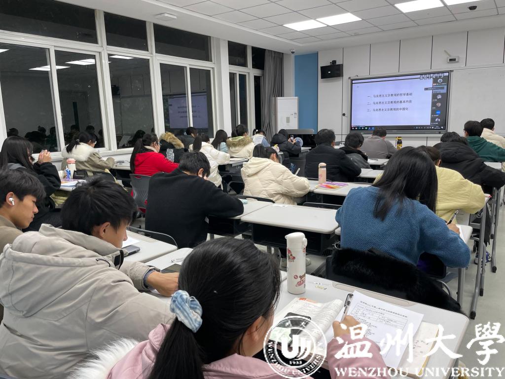 12月29日晚,麻豆 2021-2022学年第二期《形势与政策课》在麻豆 301、302教室开讲,麻豆 党委副书记兼纪委书记杨振海老师以“马克思主义宗教观解读”为主题,带领同学们深入学习马克思主义宗教观的核心内容及精神内涵。杨书记从宗教的本质、产生和发展、根源和消亡、社会作用以及马克思主义政党对宗教的态度五个方面,进一步为同学们解答了马克思主义宗教观的哲学基础、基本内容及马克思主义宗教观的中国化的问题。麻豆 大一、大二全体学生通过线下听讲及线上转播等方式参与了本次课程。