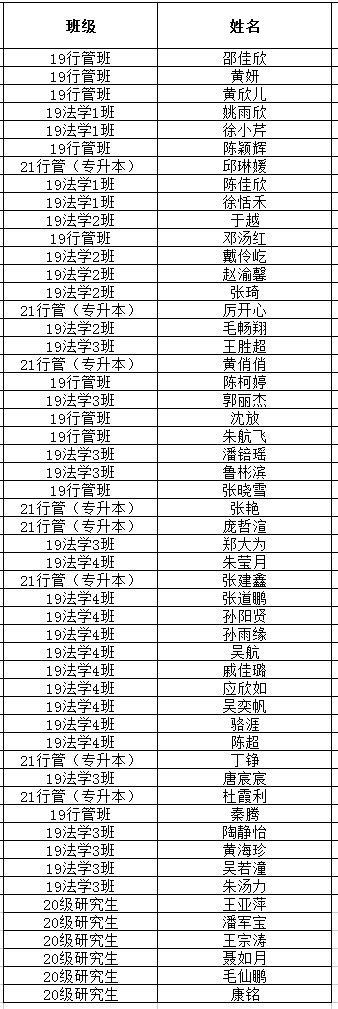 为进一步加强我院学风建设,激励学生在校勤奋学习,充分调动我院应届本科生考研和研究生考博的积极性和主动性,根据《温州大学法政校友基金奖励实施办法》,现拟对2023届考取硕士研究生、博士研究生的毕业生给予奖励。现对奖励名单公示如下: