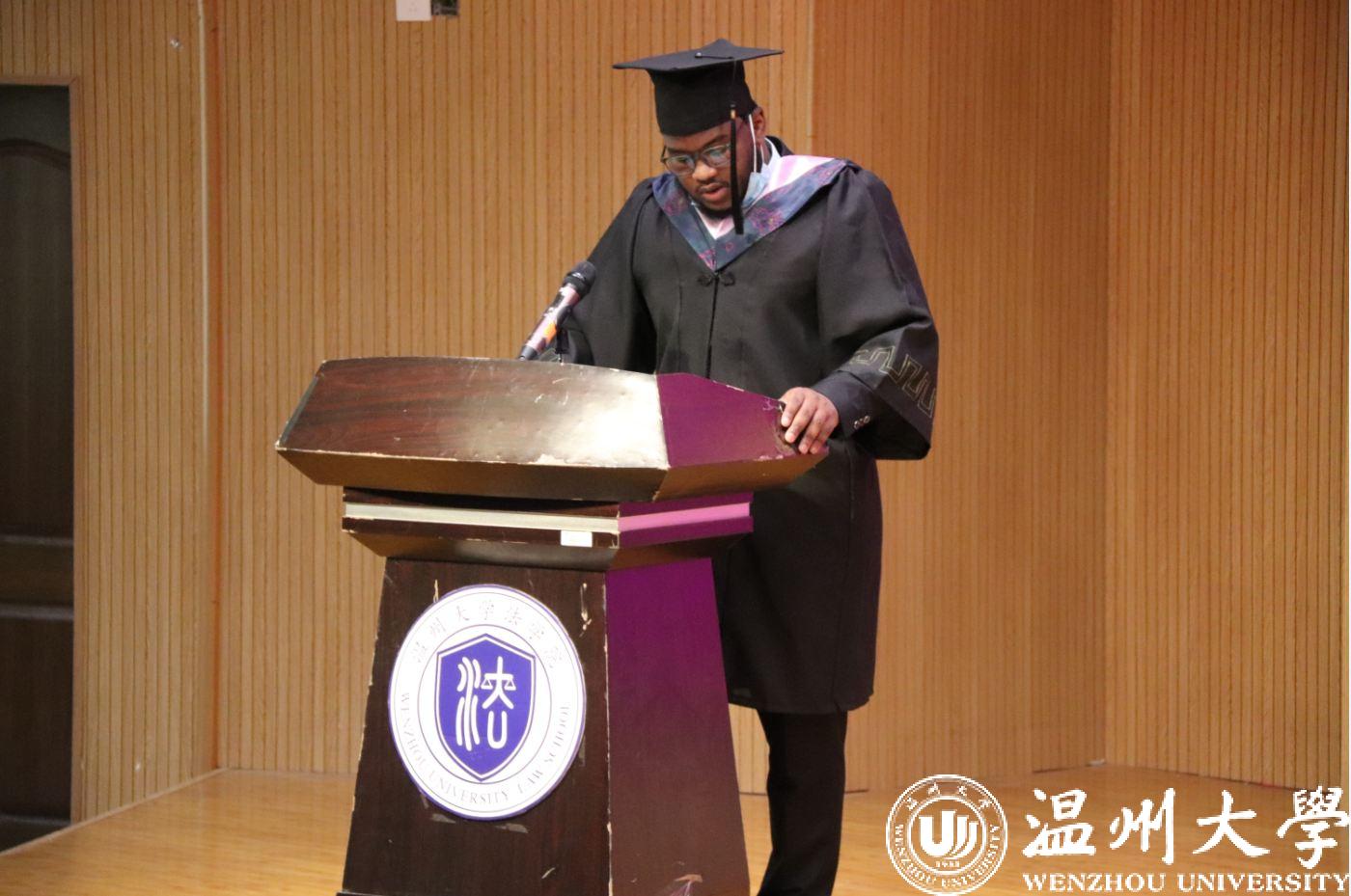 留学生代表Abdallah Usama Ibrahim 发言,他分享了四年的收获与成长,表达了对师长悉心培养的感谢,对母校的不舍与感恩。留学生活让他们学会了运用汉语,学到了他们热爱的法学专业知识,当学业圆满完成的时刻,最想表达的、也溢于言表的就是对母校教育、对温州、对中国的由衷感谢。“We are indebted to each other. The friendships that we have made here will last a lifetime.”