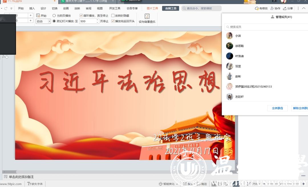 为促进习近平法治思想全面落实,推动习近平法治思想深入人心,麻豆 各班级围绕“习近平法治思想”开展主题班会活动,推动同学们牢固树立法治信仰,锤炼法律素养,进一步落实法治思想入脑入心。