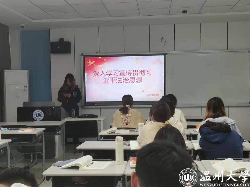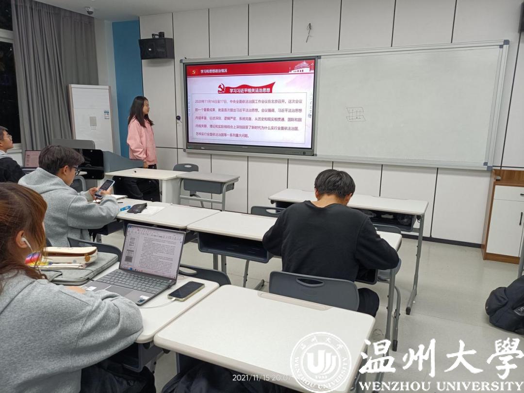 20法学1班、21法学2班、21法学4班等班级通过线上与线下相结合的方式开展了此次班会。在线下开展习近平法治思想宣传,巩固习近平法治思想入脑入心;在线上通过问卷的方式,以问答的形式加强同学们对于习近平法治思想的把握,通过碎片化的抽查方式,提醒同学们应当注意的重点与难点,积极锤炼同学们的法律素养。