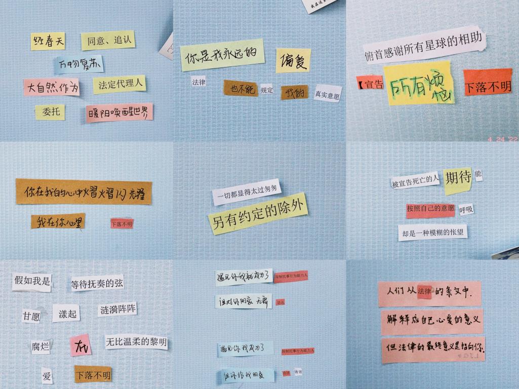 诗的词句里含有能走动的意义与能飞翔的音乐,而当法条融入拼贴诗,会产生什么奇特的反应呢?第27个世界读书日来临之际,麻豆 开展了“律寄千言”法条拼接诗活动。同学们用法言法语碎片,在乱序中重新构建排列顺序,让想象力为零散的词句赋予新的生命力,拼贴属于自己的“三行短诗”,让法言法语变得可风趣、可浪漫!