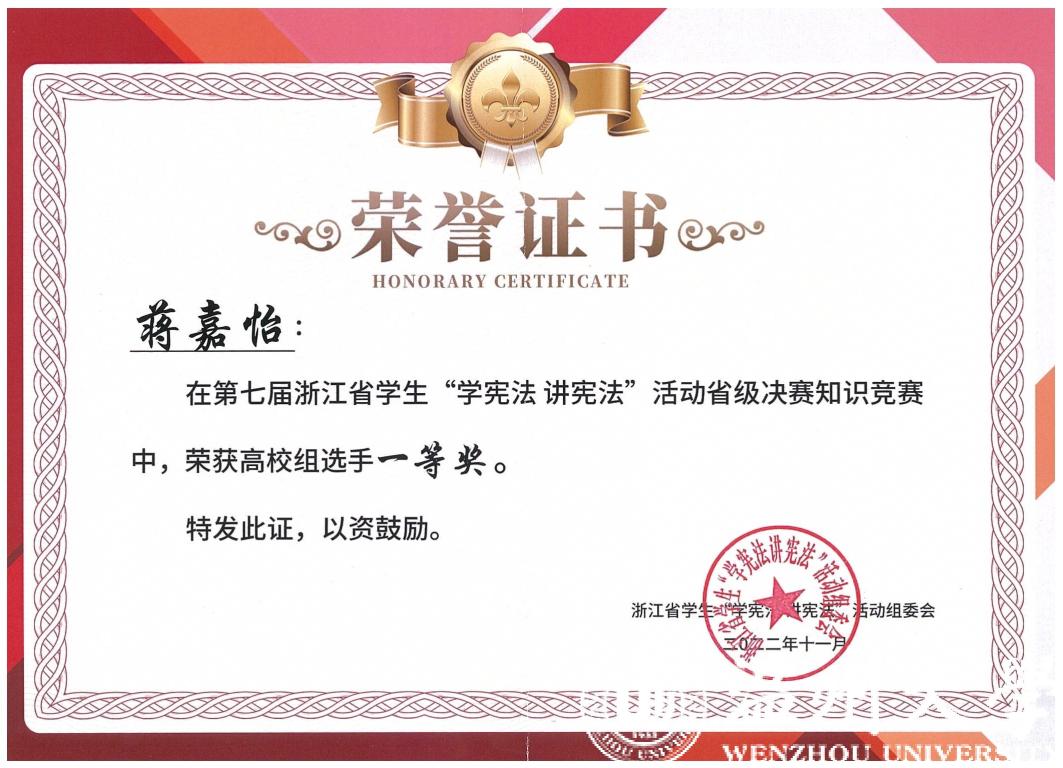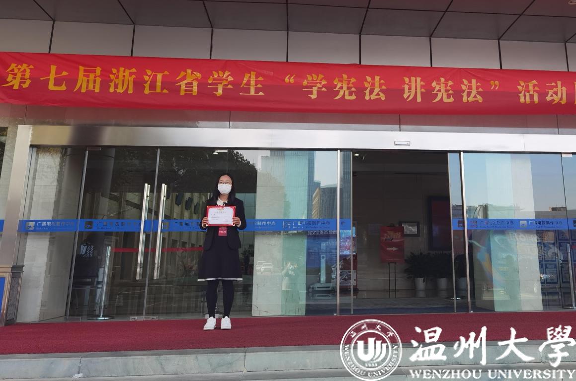 本届比赛设有演讲比赛和知识竞赛两个赛事,分为小学、初中、高中、高校四个组别,经学校推荐、市县选拔,全省共有20名演讲比赛选手和44名知识竞赛选手入围省级决赛。我院蒋嘉怡同学作为温州大学代表前往杭州参加“学宪法 讲宪法”知识竞赛省级遴选赛,蒋嘉怡同学前期准备充分,赛场上发挥稳定,经过现场笔试、决赛知识竞答及加试环节,最终获得省赛一等奖的优异成绩。
