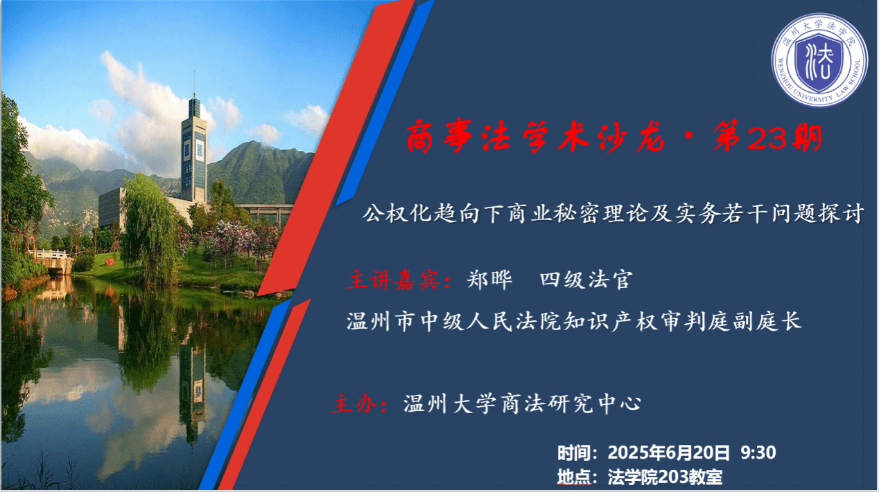 2025年6月20日上午,“商事法学术沙龙”第23期在麻豆 203教室举行。此次活动邀请到温州市中级人民法院知识产权审判庭副庭长、四级法官郑晔主讲,主题为《公权化趋向下商业秘密理论及实务若干问题探讨》。本次讲座由麻豆 李勇军教授主持,麻豆 170余名师生参加沙龙活动。