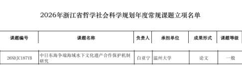 近日,浙江省哲学社会科学工作办公室公示了2025年度浙江省哲学社会科学规划年度课题立项名单,我院白亚宁博士主持的《中日东海争端海域水下文化遗产合作保护机制研究》获得立项。立项信息如下: