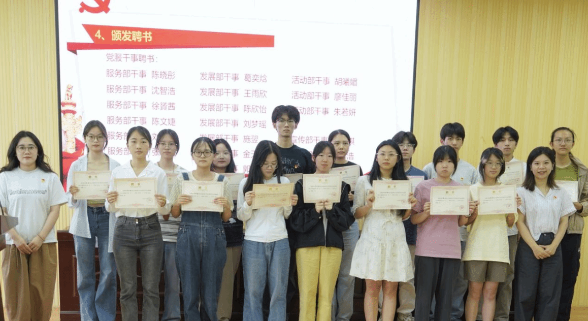 会上,各学生党支部书记为现任党服骨干、支部助理及部门负责人颁发聘书。红色的聘书不仅是身份的认证,更是“为党育人、为国育才”使命的传递,激励着每一位成员以更昂扬的姿态投身党务工作。此外,大会还对本年度各党支部优秀党务工作者、党务工作积极分子进行表彰,为全体成员树立榜样标杆。