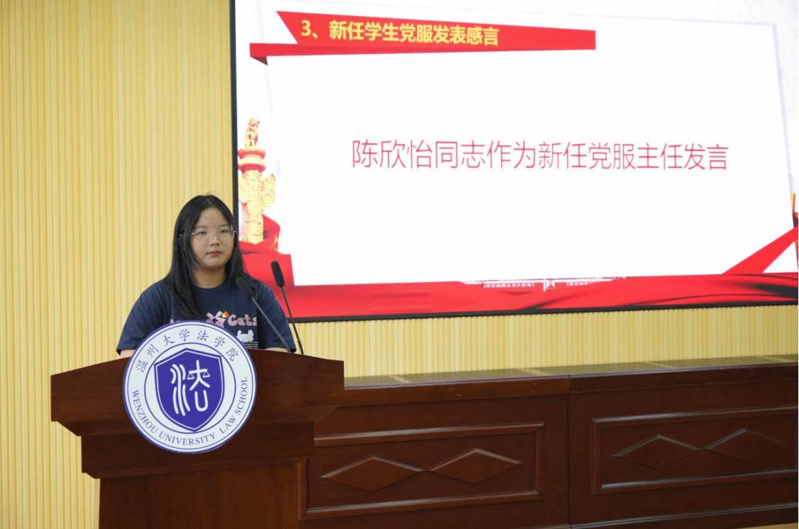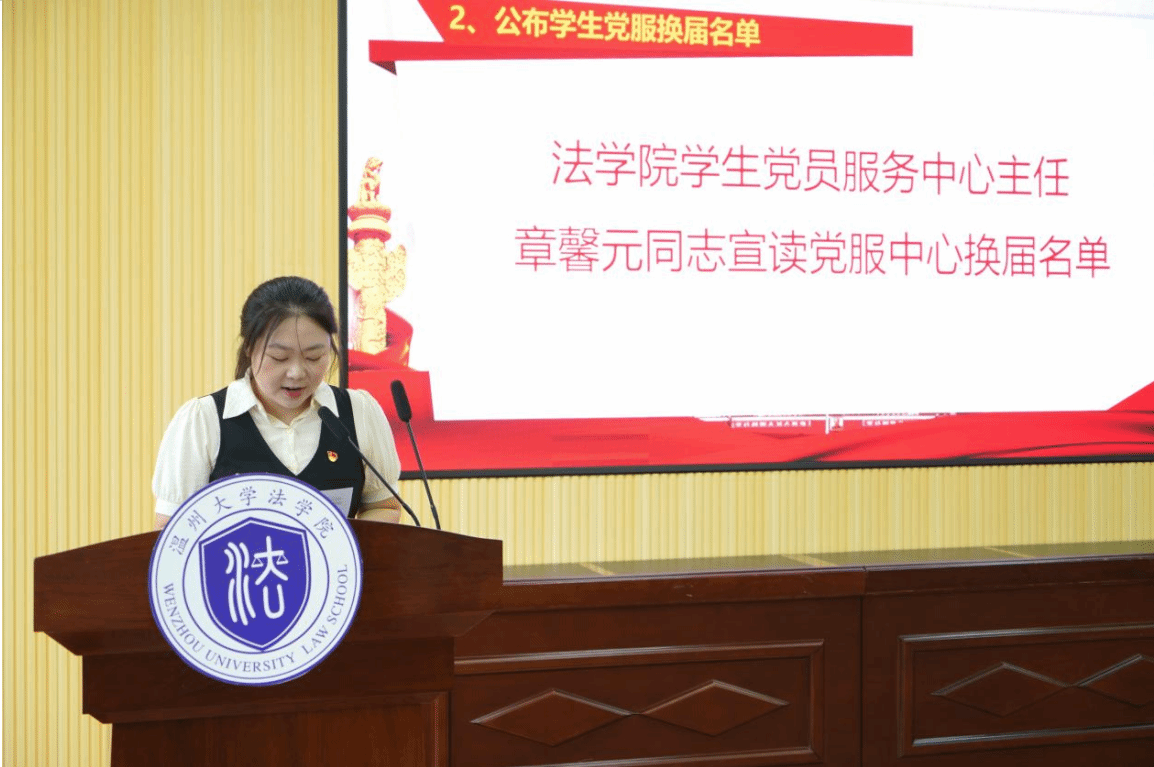 在换届环节,章鑫元同学宣读新一届党员服务中心成员名单。一批政治素质过硬、工作热情饱满的新鲜力量正式加入党服大家庭,为学院党建工作的创新发展注入强劲动能。新任党服主任陈欣怡同志在发言中表示:“接过接力棒,既是荣誉更是责任。我们将以满腔热忱接续奋斗,用更高标准、更实举措推动党服工作再创新局。”