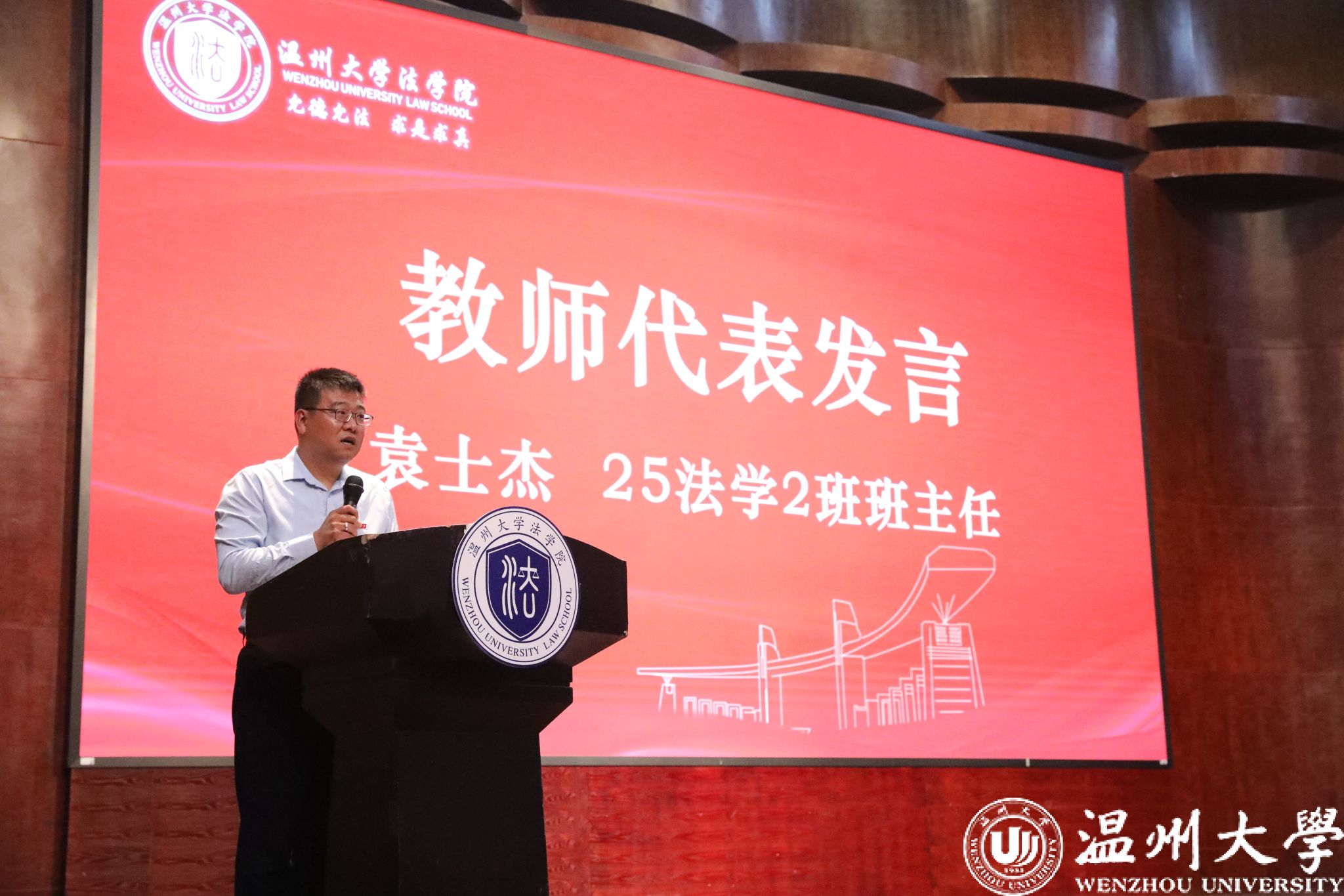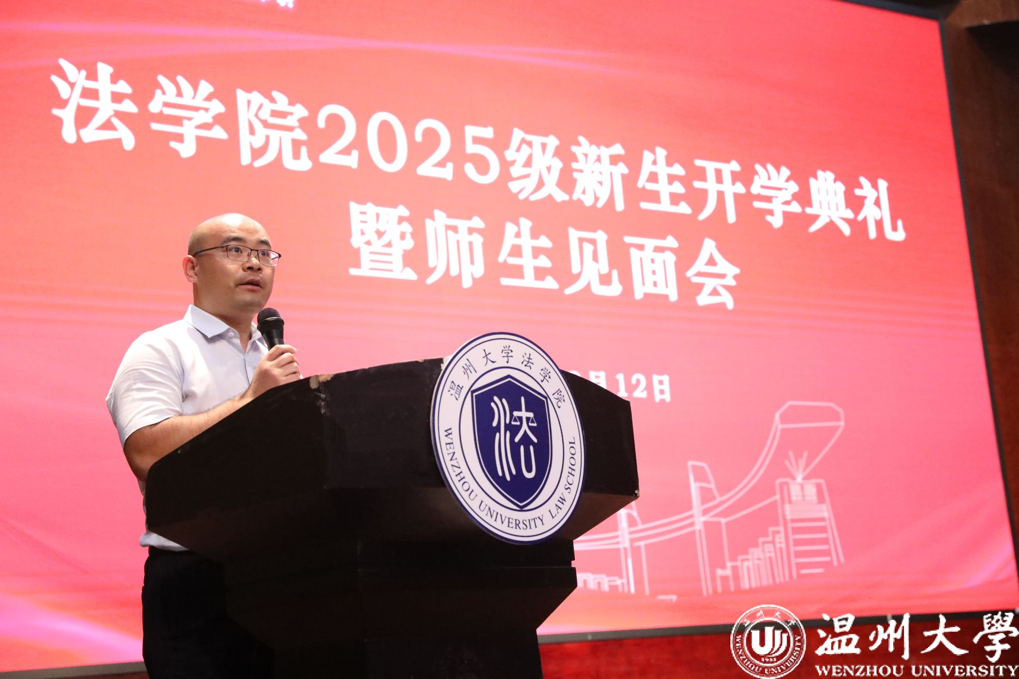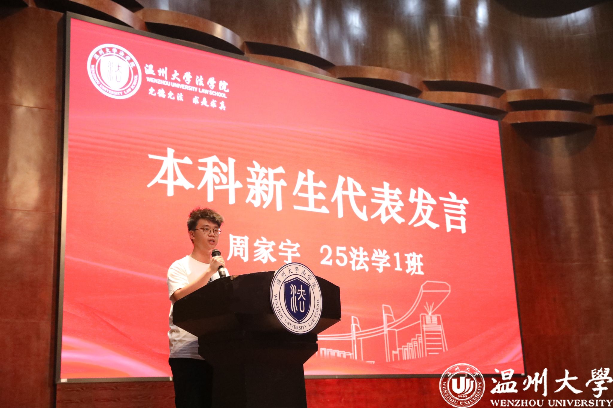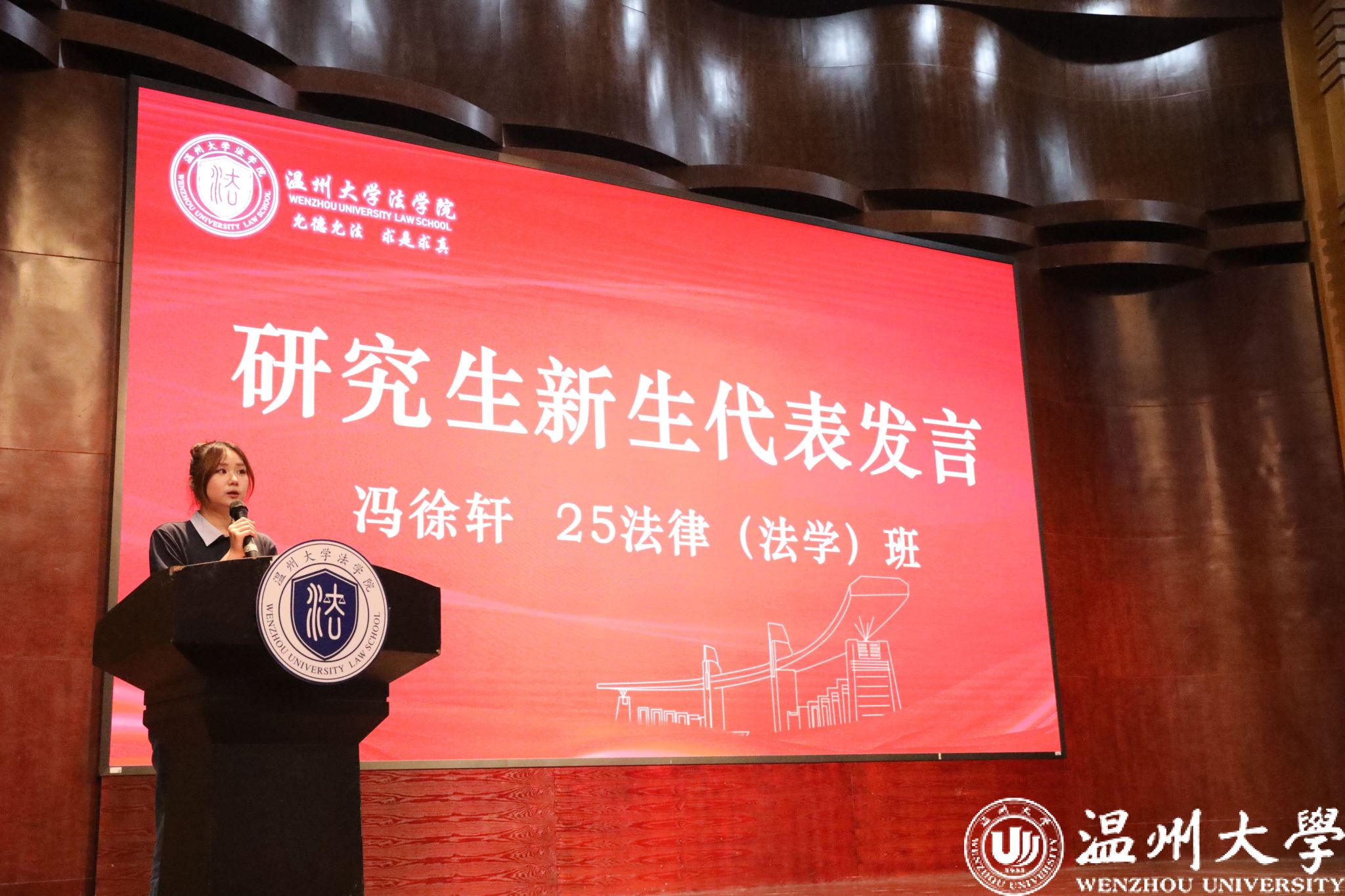 研究生新生代表冯徐轩深情回顾了考研路上的执着坚守与不懈奋斗,坦言正是这份共同的坚韧,让大家在温大相聚。她将校训“求学问是,敢为人先”与院训“允德允法,求是求真”融入期许,提出在研究生三年中应努力做到“三个把”:把研究做在书斋里,夯实专业基础,深植法学理论;把论文写在大地上,聚焦现实需求,服务温州民营经济与营商环境建设;把人生安放在时代里,德法兼修,勇担社会责任。她号召全体新生以青春为笔、以理想为墨,潜心求索,向着成长与理想坚定前行!