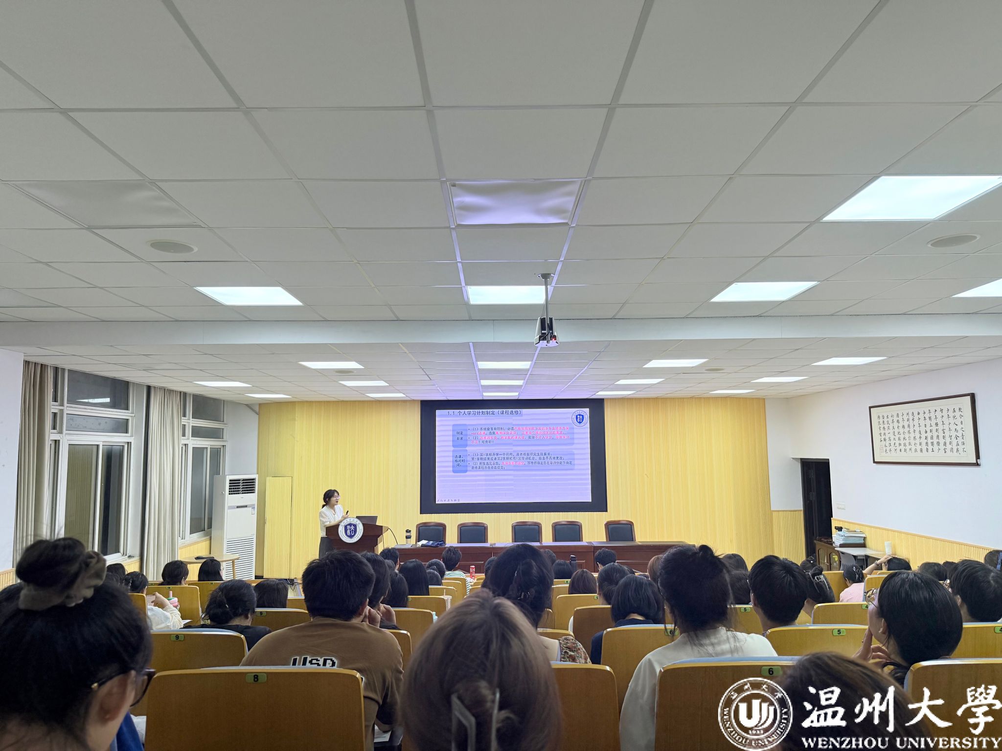 胡亚玲老师则以《研究生培养方案》为依据,从课程选修规则、导师双选流程、中期考核与筛选标准、实践实习安排细则、学位论文撰写规范和学位管理要求6个维度展开讲解。结合往届学生的实际情况,特别指出了论文写作中常见问题,并对盲审注意事项作出预警提示,提醒同学们早做准备、严守学术规范。