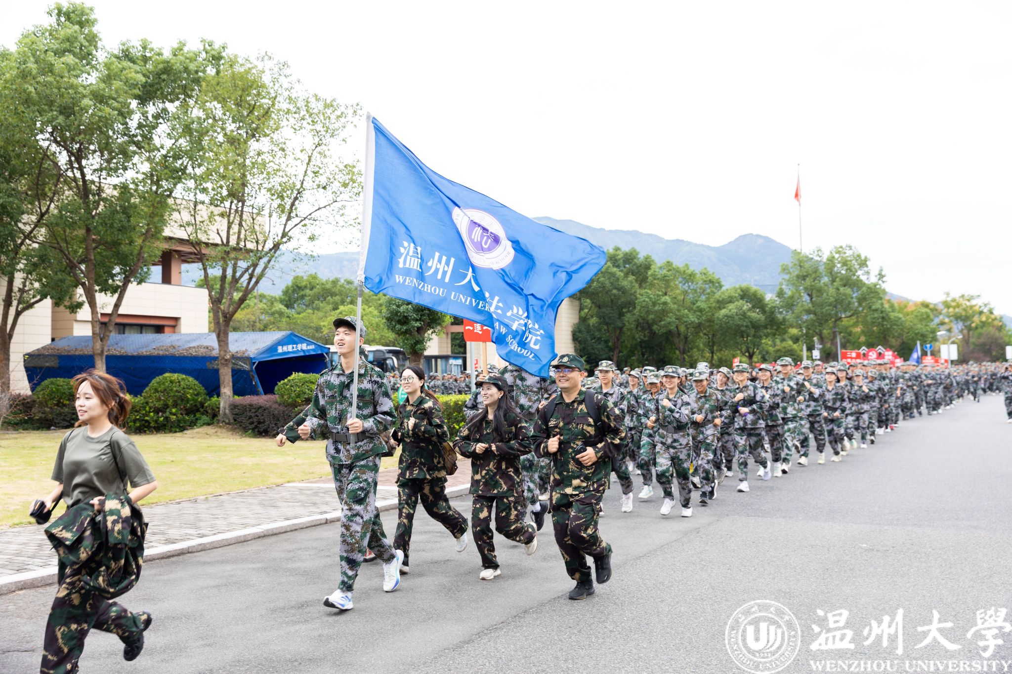 队伍沿景观大道行进,迷彩队伍如洪流涌动在环山翠色间。温州大学退役大学生教官团骨干挥舞旗帜、领唱军歌,“听吧新征程号角吹响,强军目标召唤在前方!”嘹亮歌声穿林越岭,点燃全体队员的热血豪情。全体参训学子激情澎湃,在歌声中凝聚信念,于行进中锤炼品格,传承长征精神,续写红色荣光。