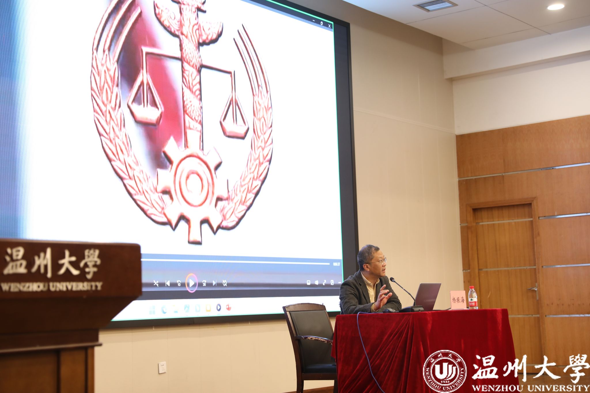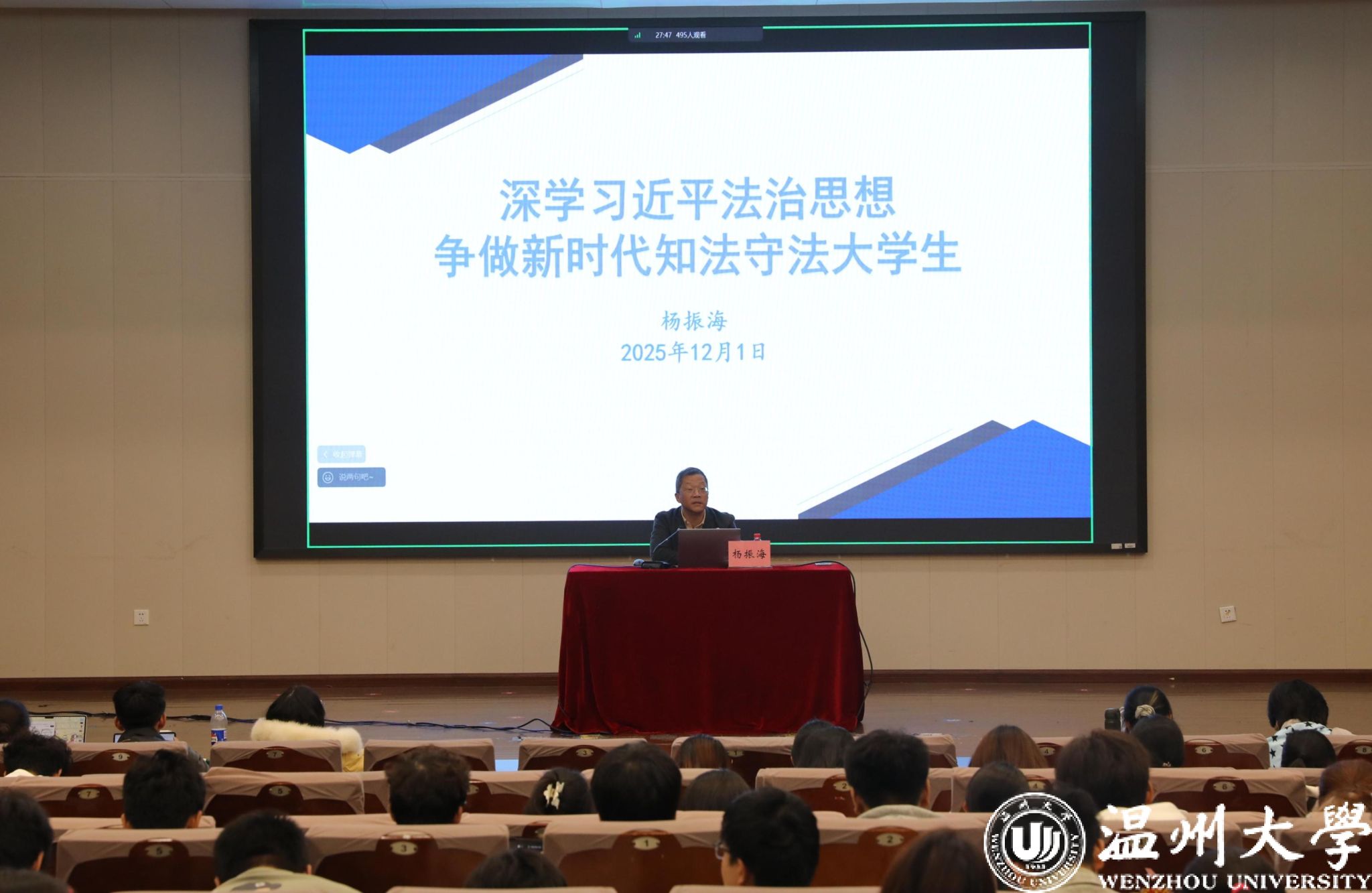 12月1日晚,麻豆 2025-2026学年第一学期第一期形势与政策课在北校区信息楼报告厅举办。本次课程以“深学习近平法治思想,争做新时代知法守法青年大学生”为主题,特邀音乐学院党委书记杨振海老师主讲。杨老师通过理论解读、案例分析与实践分享等多种形式,引导同学们共同探寻习近平法治思想的理论精髓与青年践行法治的最佳路径。